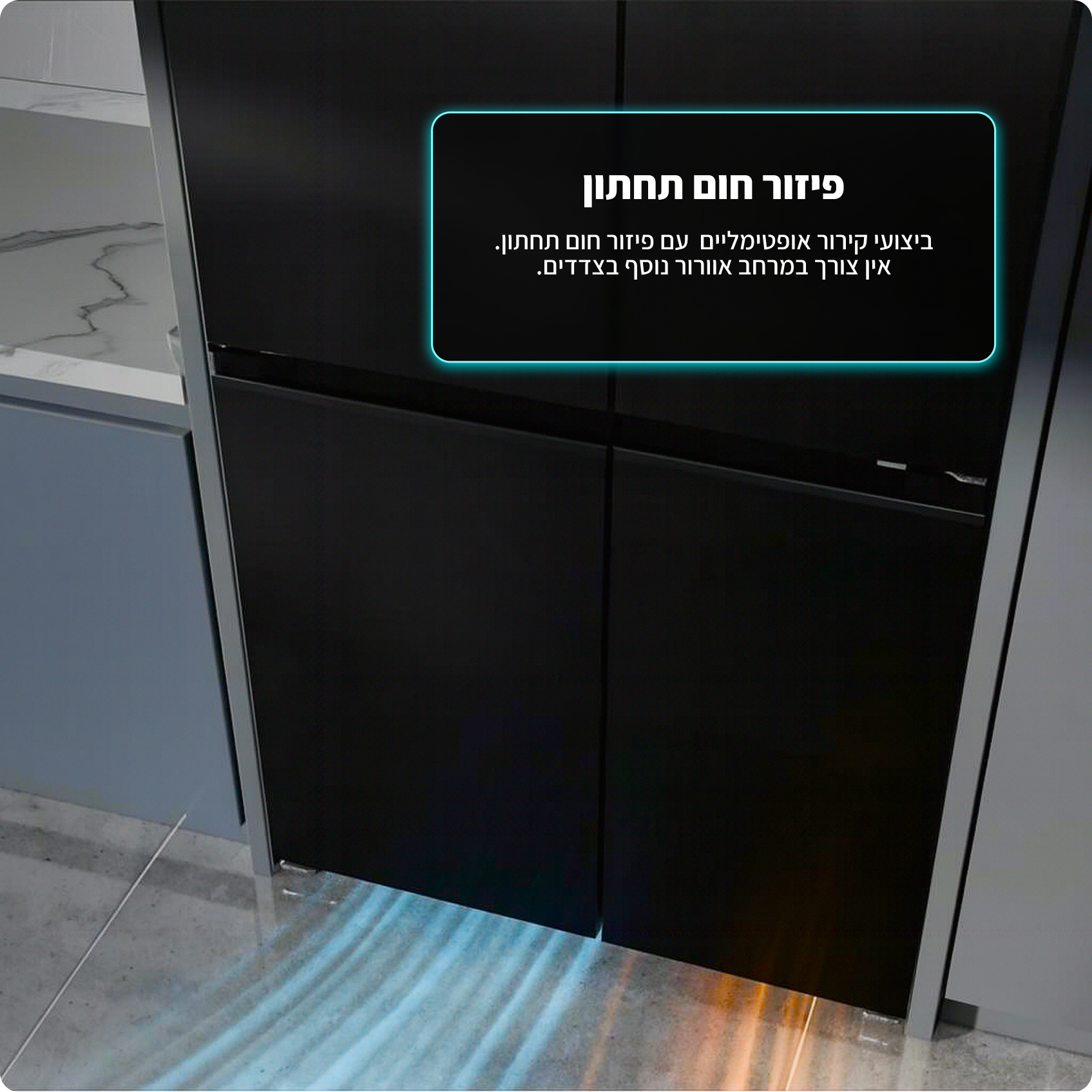 טכנולוגיית פיזור חום מתקדמת מתחתית המקרר לצורך הצבה בצמוד לקיר ובצירוף צירי דלתות פנימיים. ניתן למקם את המקרר בתוך ארון מטבח בדומה למקרר אינטגרלי. מסלולי זרימת האוויר מונעים הצטברות חום בארונות סמוכים, שומרים על שלמות מבנית ומספקים מראה אלגנטי ונקי.