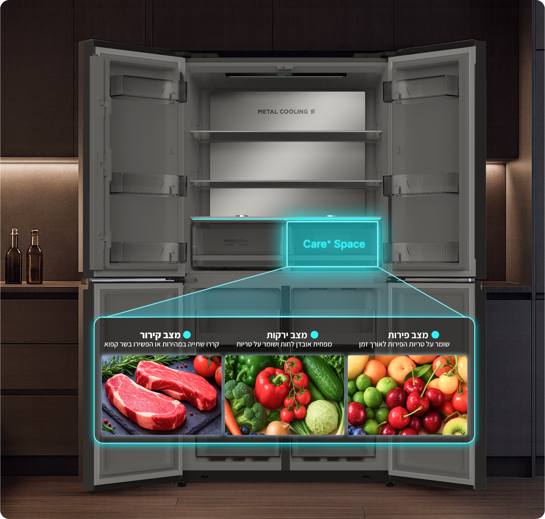 יותר אפשרויות בחירה למוצרי מזון ולשתייה, חיישנים ייעודיים וזרמי אוויר קר מספקים שליטה מדויקת בטמפרטורה באזור Care+Space .