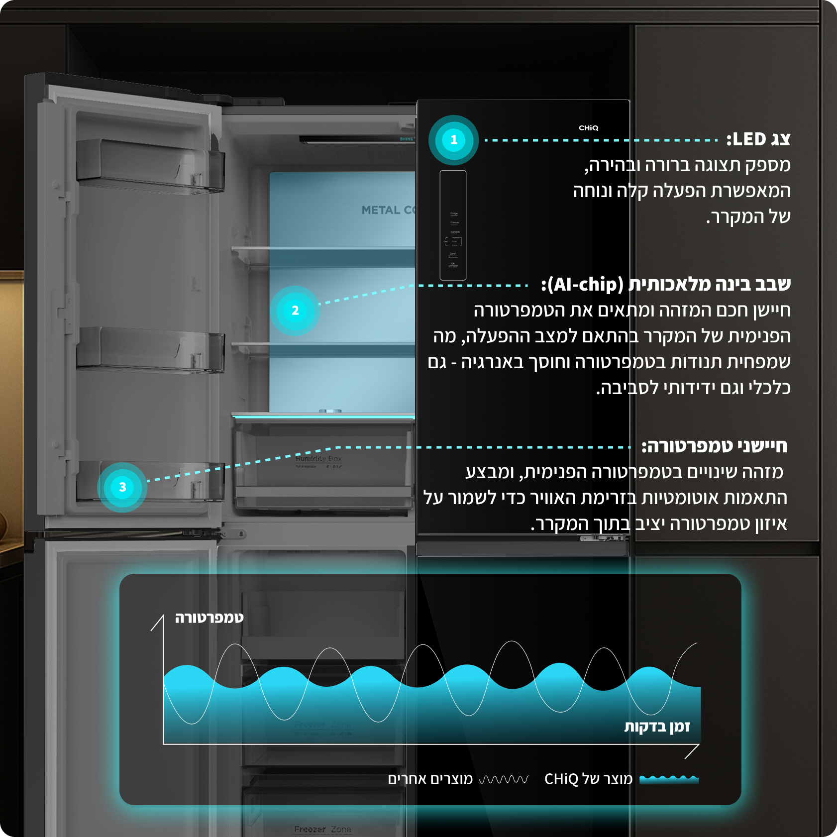 1.שבב בינה מלאכותית (AI-chip): חיישן חכם המזהה ומתאים את הטמפרטורה הפנימית של המקרר בהתאם למצב ההפעלה, מה שמפחית תנודות בטמפרטורה וחוסך באנרגיה – גם כלכלי וגם ידידותי לסביבה.