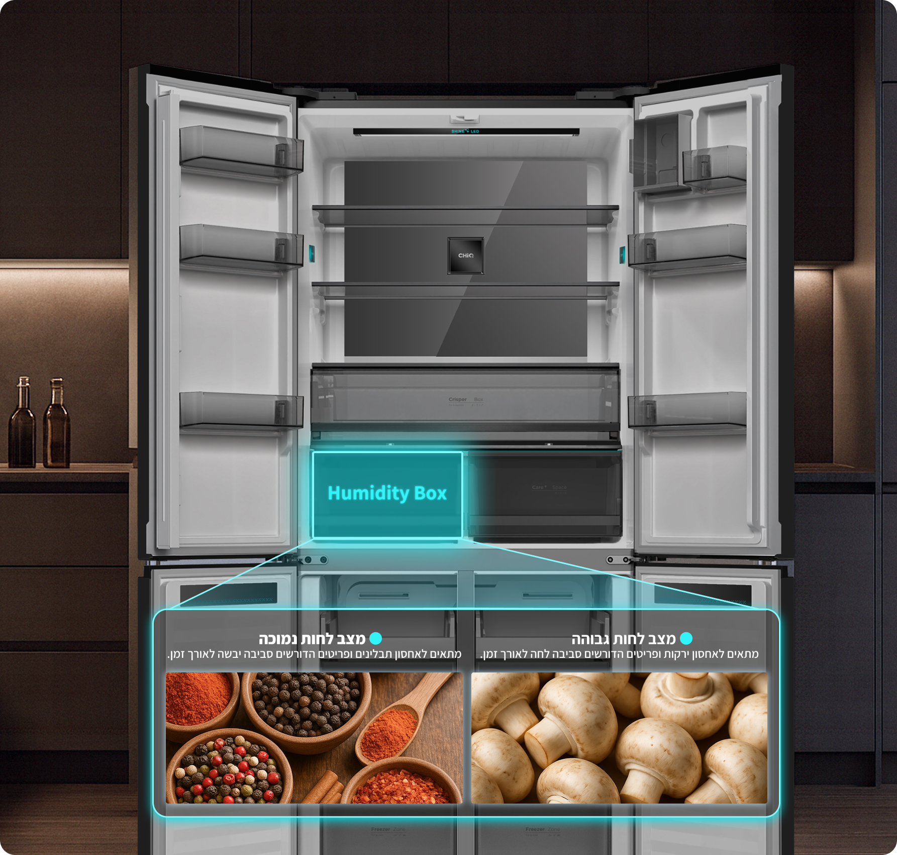 מצב לחות גבוהה מותאם לשמירה על פירות, ירקות ומזונות רגישים ללחות.