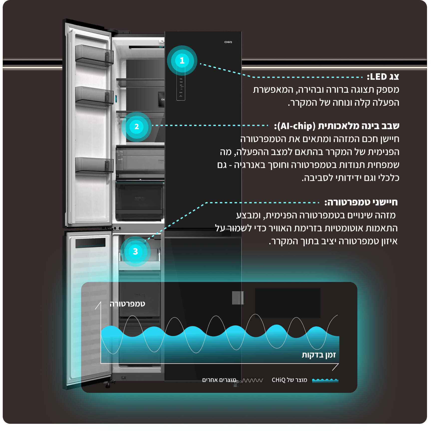 שבב בינה מלאכותית (AI-chip): חיישן חכם המזהה ומתאים את הטמפרטורה הפנימית של המקרר בהתאם למצב ההפעלה, מה שמפחית תנודות בטמפרטורה וחוסך באנרגיה – גם כלכלי וגם ידידותי לסביבה.
