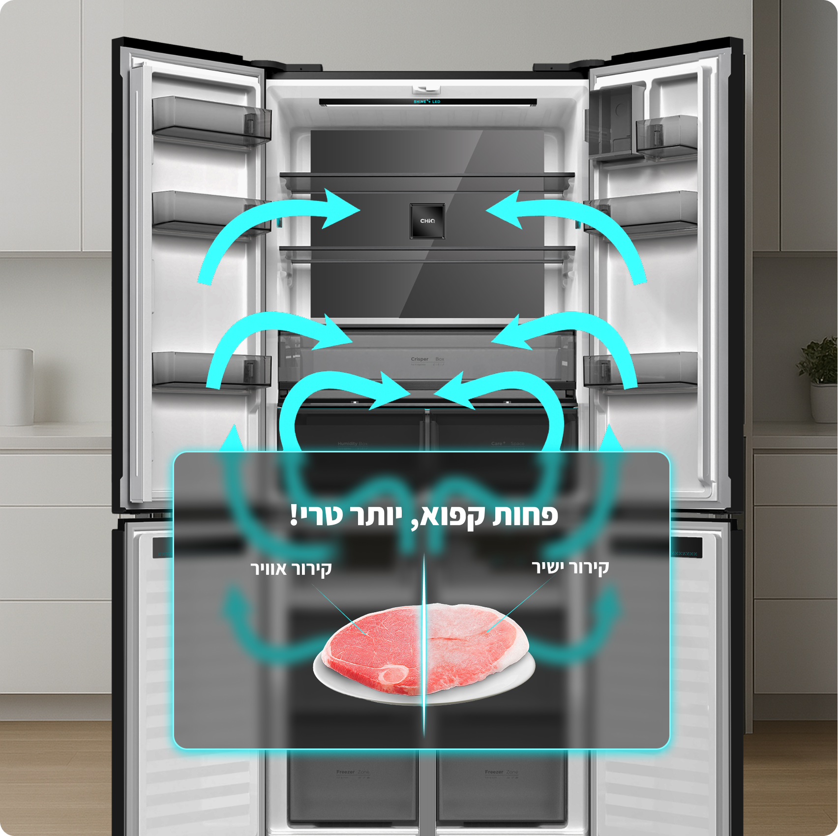 טכנולוגיה ייחודית המפזרת זרמי אוויר קר ומונעת הבדלי טמפרטורות ו"אזורים מתים" בכל חללי הקירור, וכך שומרת על הטעם ועל טריות המוצרים המאוחסנים.